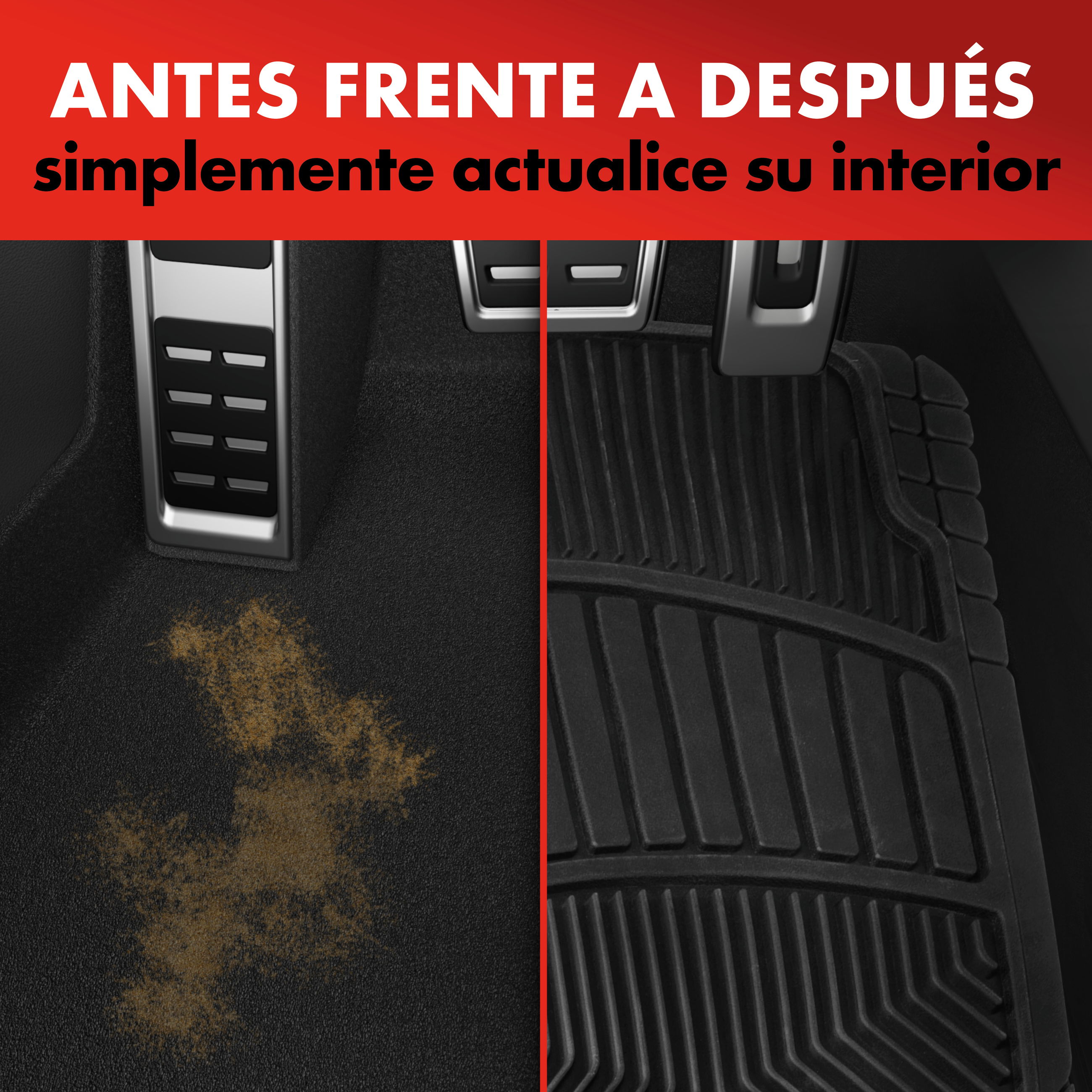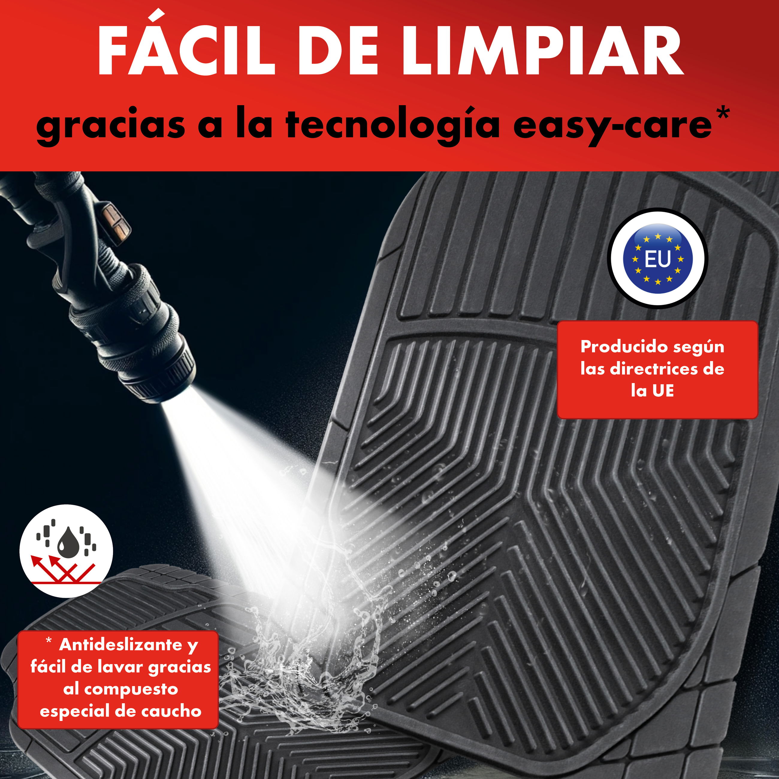 El juego de alfombrillas se puede cortar fácilmente a medida con unas tijeras y se puede colocar en el espacio para los pies de casi cualquier coche. Esta versatilidad, combinada con su fácil limpieza, hacen del juego de alfombrillas de goma Priscus un compañero inmejorable en su coche.