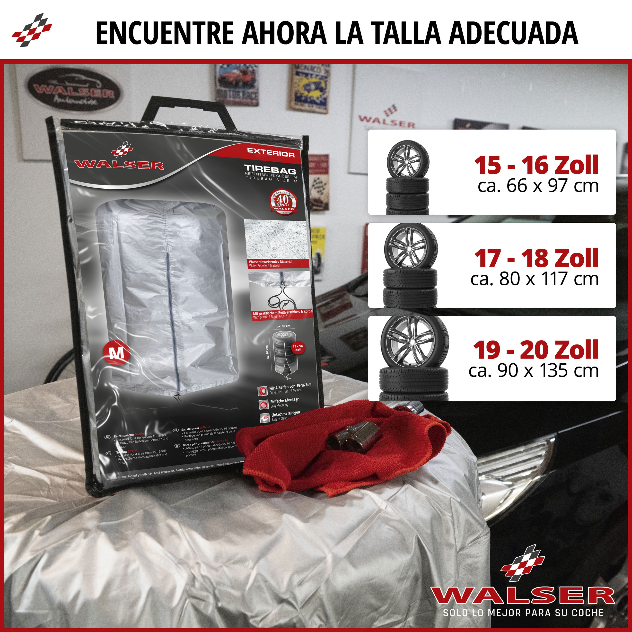 La bolsa para cuatro neumáticos está fabricada en material hidrófugo y especialmente robusto, con revestimiento plateado. Esto significa que sus neumáticos están bien embalados para su almacenamiento y protegidos de forma óptima contra la suciedad y la humedad. La bolsa también protege el área alrededor del lugar de almacenamiento de antiestéticas rayas negras o arañazos en las paredes, por ejemplo.