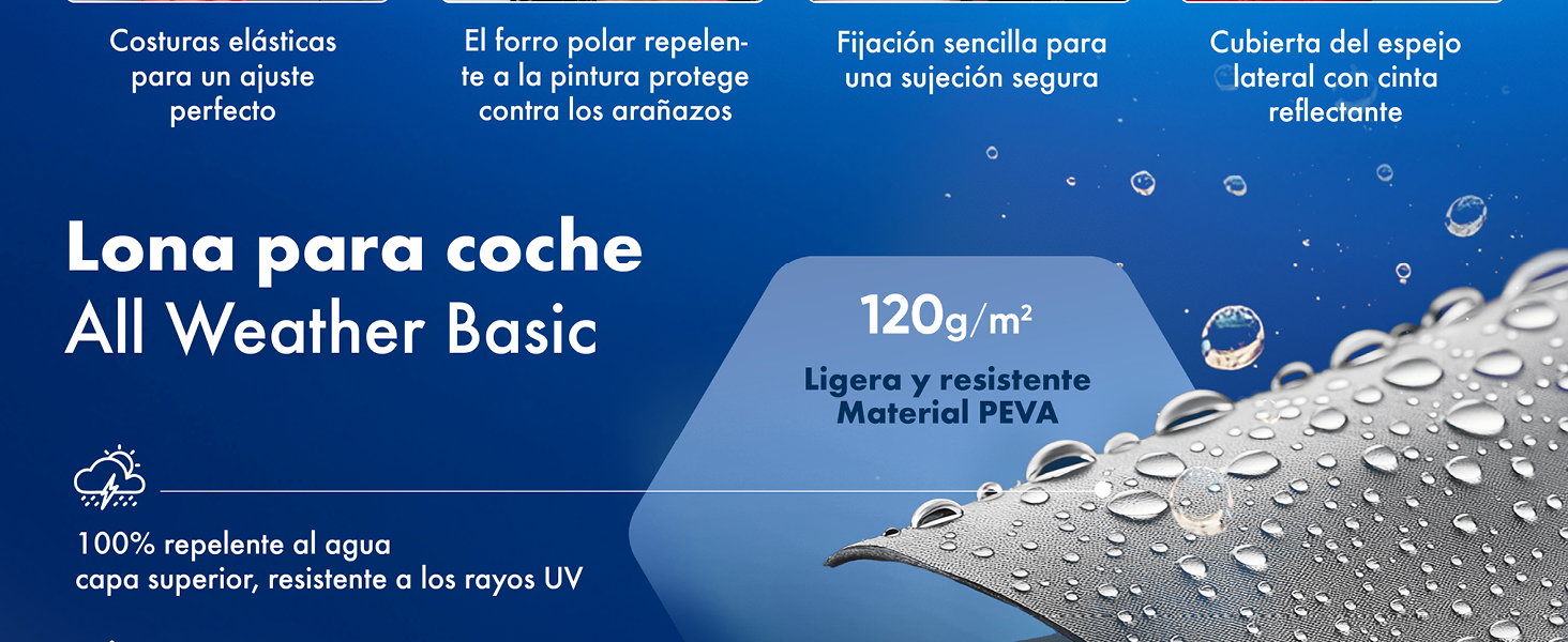 All Weather está fabricado con un resistente tejido no tejido de 120 g/m² recubierto de PEVA, que lo hace impermeable - una gran ventaja para el uso en exteriores. Protege su vehículo de la lluvia, el hielo, la nieve y otras suciedades como el polvo, los excrementos de pájaros y las hojas. La lona también se puede utilizar en el interior si su coche se deja sin usar en el garaje durante un largo periodo de tiempo.